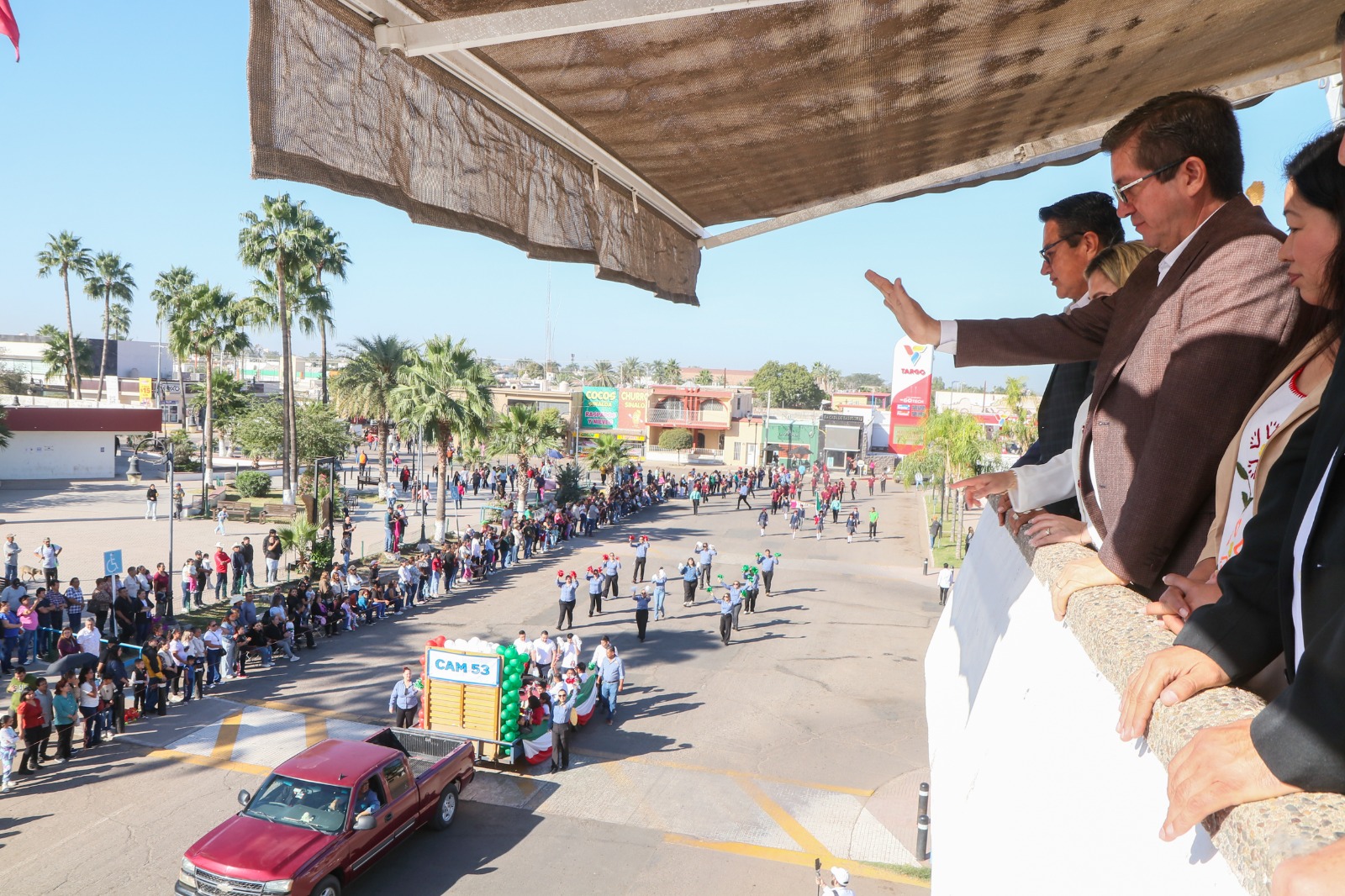 Desde el balcón presidencial de Palacio, Elías Retes recibió el saludo cordial de los distintos contingentes de las escuelas primarias, y respetuosa e institucionalmente de agentes de la Comisaría de Seguridad Pública y Tránsito Municipal que abrieron el evento a bordo de moto patrullas.